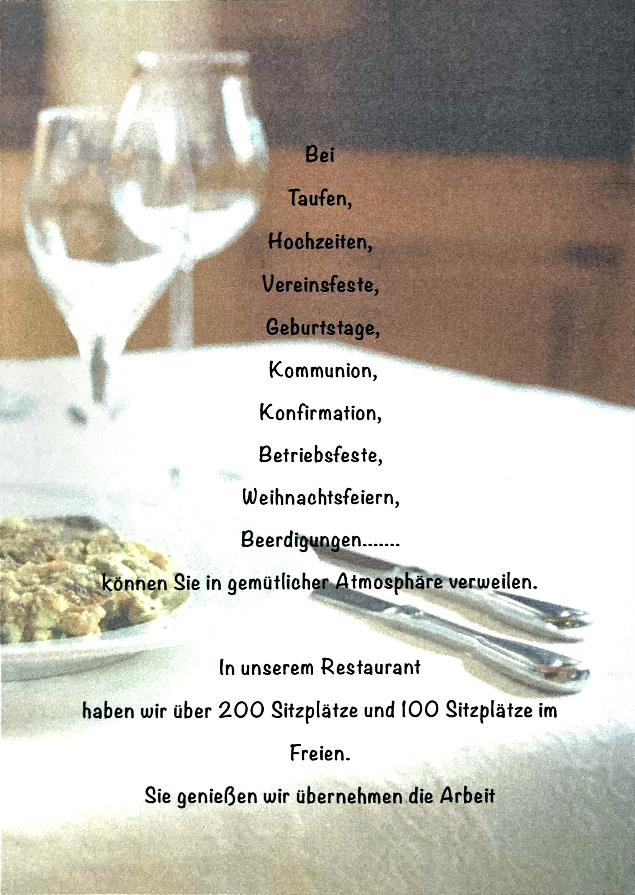 Usere Räumlichkeiten sind geräumig und können an Ihre Bedürfnisse angepasst werden. Unser Personal ist freundlich und professionell und steht Ihnen bei der Planung Ihres Events zur Seite. Unser Restaurant bietet auch Catering-Optionen für Veranstaltungen außerhalb des Restaurants. Wir bietet auch eine Cocktailbar und eine Kegelbahn, die für ihre Veranstaltungen genutzt werden können.